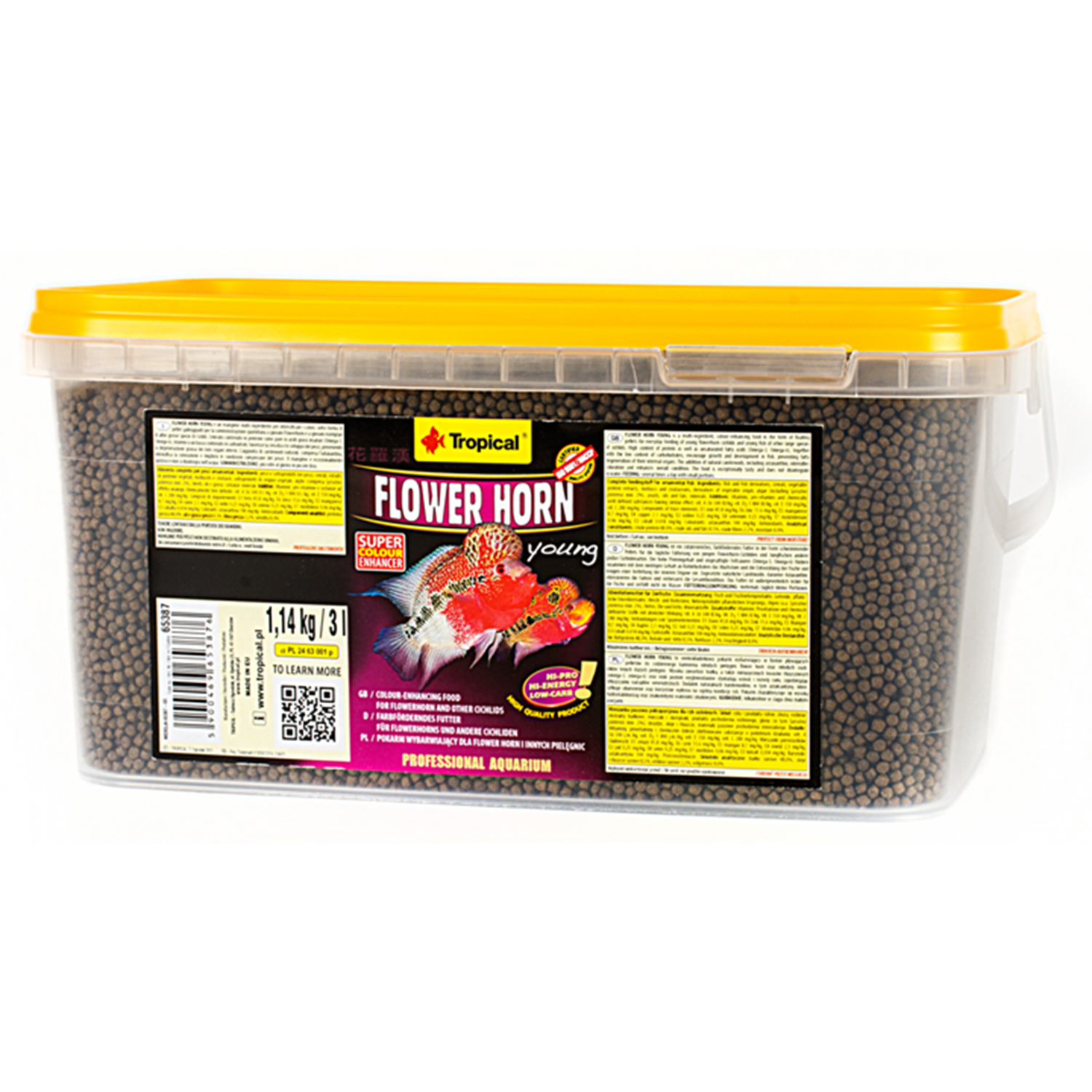Flower Horn Young Pellet, Flower Horn çiklitleri ve Cichlidae familyasının diğer türleri için granül formunda, yüksek proteinli, yüzen bir yemdir.